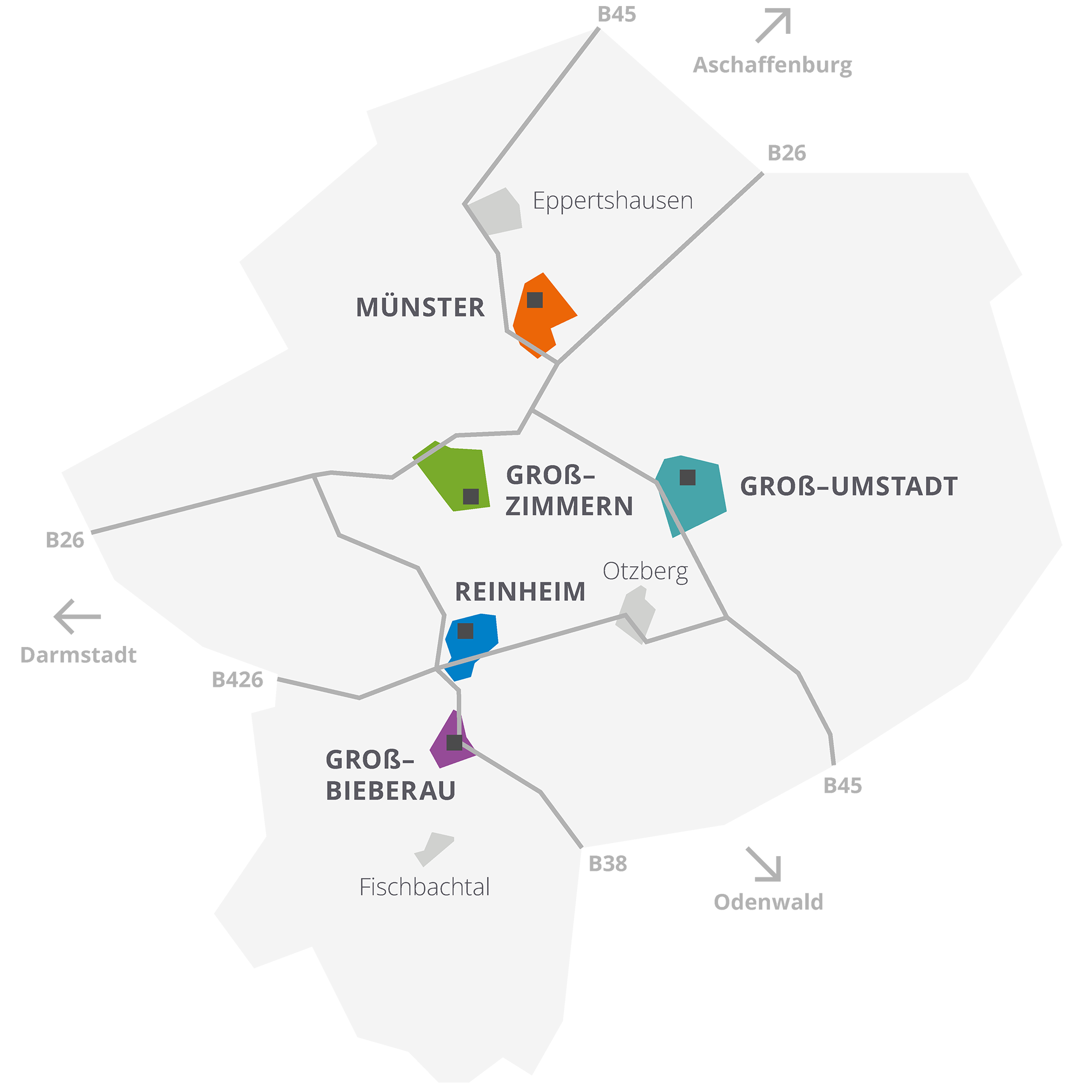 Im Landkreis Darmstadt-Dieburg sind wir mit stationären und teilstationären Einrichtungen vertreten. Zu unserem Leistungsspektrum gehören neben der Pflege in unseren Einrichtungen auch betreutes Wohnen sowie Essen auf Rädern.